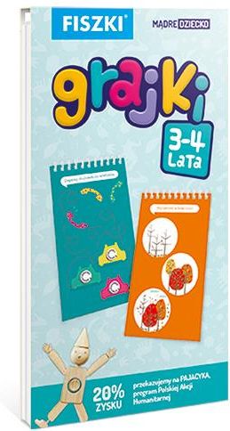 "Fiszki Grajki 3-4 lata" autorstwa Kingi Perczynskiej 160 interesujących gier edukacyjnych zostało zaprezentowanych na 40 dwustronnych, pełnych kolorów kartach. A na każdej z nich, młode umysły z pewnością zaciekawią ciekawie zaprojektowane i uwielbiane przez dzieci gry, takie jak: przepracuj się przez labirynt, wykryj różnice, dokończ ciąg, zorganizuj sekwencję obrazków, zidentyfikuj element, który nie pasuje, dopasuj kształty. Na odwrocie każdej fiszki znaleźć można dodatkowe zagadki i problemy do rozwiązania, które pobudzają dziecko do myślenia, wyrażania swoich przemyśleń i umożliwiają prowadzenie ciekawych rozmów dorosłym z maluchem. To nie tylko test, ale przede wszystkim nauka myślenia! Krótko mówiąc, zabawy te wzmacniają spostrzegawczość, koncentrację, rozwijają zdolności logicznego myślenia, poszerzają wiedzę o otaczającym świecie oraz wzbogacają słownictwo. EAN: 9788378432326 Najczęściej zadawane pytania Jakie są walory stosowania książeczek edukacyjnych dla maluchów?Kupowanie książek dla maluchów każdego dnia ma wiele zalet. Wspomagają dzieci w nauce pisania, czytania, liczenia, odróżniania kształtów, nauczają je kolorów i nie tylko. Czytanie książek poszerza zakres słów, pobudza fantazję oraz sprawia radość. Książeczki edukacyjne dla dzieci umożliwiają również rozwijać inteligencję, empatię i kreatywność, a także przedstawiają niezwykle ciekawe fakty a także ciekawostki na temat zwierząt, geografii, wydarzeń historycznych, zabytków, wielkich odkryć itd. Dlaczego powinno się kupić książki edukacyjne z faktami naukowymi oraz ciekawostkami dla dzieci?Książeczki do nauki i zabawy z faktami i ciekawostkami o świecie to doskonała niespodzianka dla maluchów w różnym wieku. Takie książki są kolorowe, posiadają piękne rysunki, a ich font jest wyrazista i dostosowana dla czytelników w wieku poniżej piątego roku życia, jak i dzieci starszych. książki z faktami i ciekawostkami umożliwiają dzieciom zwiększyć własną wiedzę na takiego rodzaju kwestie jak fauna i flora, produkty spożywcze, przedmioty użytku codziennego, a także i geografia Polski i świata, astronomia, wydarzenia historyczne, zabytki, znaczące odkrycia itd. Jakiego typu książeczki edukacyjne najlepiej zakupić dla 3 latka?W naszym bardzo szerokim asortymencie można natknąć się na ciekawe rozwiązania różnego typu w tym także takie jak książeczki dla maluchów w wieku 3 lat. Takie książki wprost idealnie wpływają na rozwój małego dziecka, umożliwiają wzbogacić znajomość jego słów, wspierają rozwój myślenia logicznego i zwiększają jego ogólną wiedzę o otaczającym nas środowisku. Dla maluchów w wieku trzech lat zalecamy książki edukacyjne do czytania, pisania, liczenia lub rozróżniania kształtów a także barw. Zapewniamy również pozycje wpływające na rozwój pomysłowości, inteligencji, inteligencji emocjonalnej albo z opowiadaniami z morałem. Jakiego rodzaju książki edukacyjne wybrać dla 4 i 5 latka?Wśród naszego bogatego asortymentu można znaleźć m.in. zalecane przez specjalistów książeczki do nauki i zabawy dla maluchów w wieku czterech i pięciu lat, a również i tomiki dla starszych dzieci. Wielką zaletą tego typu pozycji jest to, że znakomicie rozwijają inteligencję, pomysłowość, empatię, a takżewiele innych zdolności potrzebnych w dalszym życiu, takich jak na przykład czytanie, pisanie bądź liczenie. Prócz tego czytanie ciekawych opowieści dla maluchów albo książek o gwiazdach, podróżach, geologii, zabytkach, wydarzeniach historycznych czy odkryciach wzbogaca słownictwo, naucza je poprawnej składni, wzbogaca ich wiedzę na przeróżne tematy ogólne a także rozwija logiczne myślenie. Książki do nauki dla najmłodszych do poszerzania logicznego myślenia i pomysłowości.Obeznanie to nie wszystko. W życiu liczy się także wiele różnorakich zdolności, takich jak na przykład inteligencja, kreatywność, empatia itd. W naszej księgarni internetowej można natrafić na ogromną ilość książeczek do nauki dla dzieci w wieku 0-5 lat, które mają cel dbać o inteligencję, inteligencje emocjonalną a także pomysłowość a również i logiczne rozumowanie. Wśród naszych produktów można również odnaleźć książki, jakie wspomagają w uczeniu się nowych słów, a również i książki, jakie zachęcają dziecko odkrywać świat, jaki nas otacza. W jaki sposób można zamówić książki edukacyjne dla maluchów?Zakup książek edukacyjnych dla maluchów w naszej księgarni internetowej Matfel jest bardzo łatwy i zajmuje tylko parę minut. Wystarczy dane książeczki włożyć do kosza, a następnie złożyć zamówienie. W razie nurtujących pytań prosimy o kontakt – gwarantujemy najwyższej jakości wsparcie i doradztwo. Poza tym oferujemy błyskawiczną i bezpieczną przesyłkę na obszarze całego kraju, a również i za granicą. Zapraszamy do zapoznania się z naszymi produktami. Jakie są typy książeczek edukacyjnych dla dzieci?Książki edukacyjne dla najmłodszych można podzielić na kilka grup. W naszym sklepie Matfel można znaleźć lektury dla dzieci w każdym wieku – dla dwu-, trzy-, cztero-, pięciolatków i starszych dzieci. Ponadto książeczki te dotyczą najróżniejszych kwestii – wspomagają naukę pisania, czytania lub liczenia, umożliwiają rozwijać różne zdolności oraz umożliwiają zyskanie wiedzy o astronomii, zwierzętach, zabytkach, wydarzeniach historycznych, wielkich odkryciach czy geografii Polski i świata itd. Kiedy najlepiej nauczyć malucha liczyć?Wśród naszych produktów można również znaleźć książeczki do nauki, jakie ułatwiają dzieciom zapoznać się z cyframi, a potem wspomagają one w trakcie nauki rachunków. Choć nauka liczenia ma miejsce dopiero w szkole podstawowej, kiedy maluch ma 6 albo 7 lat, to psychologowie zalecają, aby ro