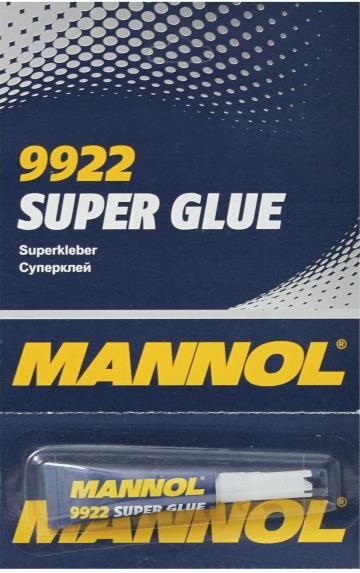 MANNOL 9922 Super Glue Kleje i zestawy naprawcze do plastiku MANNOL Super Glue jest przeznaczony do natychmiastowego i ultra-mocnego klejenia wszystkiego rodzaju tworzyw sztucznych, ceramiki, porcelany, wyrobów ze szkła, metali, polichlorku winylu, winylu, drewna, papieru, cementu, skóry, marmuru, a także ich związków. kod produktu 9922-MANNOL Pojemność 3g