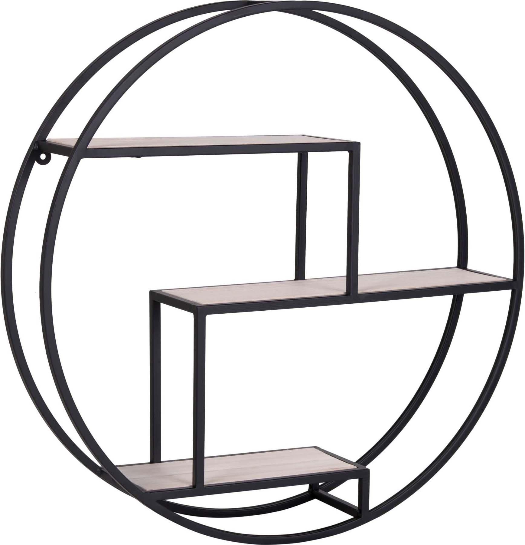Okrągła półka ścienna Rotterdam z półkami z naturalnego drewna, czarna rama - 62x14 cm Dzięki charakterystycznemu okrągłemu kształtowi i półkom z naturalnego drewna, półka ścienna Rotterdam jest jedną z najbardziej przyciągających wzrok półek dekoracyjnych, która jest nie tylko funkcjonalna, ale także stanowi element wystroju. Czarna metalowa rama ostro kontrastuje z poziomami jasnego drewna, dzięki czemu jest wizualnie dynamicznym elementem w każdym wnętrzu. Stylowy okrągły kształt w sercu przestrzeni Okrągły kształt przełamuje monotonię kanciastych mebli, służąc jednocześnie jako niewielka, praktyczna przestrzeń do przechowywania. Idealny na rośliny, małe obrazki, książki lub świece. Wymiary. To także doskonały wybór na prezent.