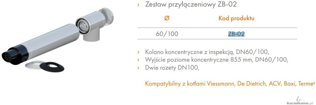 Zestawy podłączeniowe Ricom ZB-02 poziome połączenie powietrzno-spalinowe DN 60/100 | RICOM ZB02 Zestaw podłączeniowy przez ścianę Ricom ZB-02 to wysokiej jakości rozwiązanie dla osób poszukujących efektywnego i bezpiecznego sposobu podłączenia kotłów gazowych. Dzięki zastosowaniu elementów z polipropylenu, zestaw ten charakteryzuje się odpornością na wilgoć oraz wysokie temperatury, co sprawia, że jest idealnym wyborem do systemów, które pracują w trudnych warunkach. Ricom ZB-02 to poziome wyprowadzenie powietrzno-spalinowe o wymiarach DN 60/100, które zapewnia doskonałą kompatybilność z kotłami działającymi w trybie mokrym. W skład zestawu Ricom ZB-02 wchodzą kluczowe elementy, które gwarantują łatwość instalacji i szczelność systemu, co zwiększa bezpieczeństwo jego użytkowania. Kolano koncentryczne z inspekcją DN60/100 Wyjście poziome koncentryczne 855mm, DN60/100 Dwie rozety DN100 Dodatkowo, zestaw posiada silikonowe uszczelki, które zapewniają gwarancję szczelności instalacji. Produkt jest gotowy do pracy w nadciśnieniu i jest kompatybilny z kotłami takich marek jak Viessmann, De Dietrich, ACV, Baxi oraz Termet. Oprócz tego, Ricom ZB-02 posiada certyfikat CE, co potwierdza jego wysoką jakość i bezpieczeństwo użycia. Systemy kominowe RICOM – nowoczesne i trwałe rozwiązania do odprowadzania spalin RICOM to wiodący producent systemów kominowych, który oferuje innowacyjne rozwiązania dostosowane do różnorodnych instalacji grzewczych. Systemy marki RICOM znajdują zastosowanie zarówno w domach jednorodzinnych, budynkach wielorodzinnych, jak i obiektach przemysłowych. Dzięki precyzyjnemu wykonaniu, wysokiej jakości materiałom oraz zgodności z normami bezpieczeństwa, systemy kominowe RICOM gwarantują niezawodność, trwałość i efektywność. Rodzaje systemów kominowych RICOM Systemy koncentryczne PP-PP oraz PP-AL – przeznaczone do kotłów kondensacyjnych, zapewniają optymalne odprowadzanie spalin i doprowadzanie powietrza do spalania. Systemy jednościenne PP SING – doskonałe jako wkłady do istniejących kominów murowanych lub stalowych. Systemy elastyczne PP FLEX – idealne do renowacji przewodów kominowych o nieregularnym kształcie. Systemy stalowe SW i DW – wykonane ze stali nierdzewnej, dedykowane do instalacji wysokotemperaturowych i przemysłowych. Systemy kaskadowe i zbiorcze LAS – dedykowane dla budynków wielopiętrowych oraz kotłowni zbiorczych. Najważniejsze cechy systemów kominowych RICOM Kompatybilność – systemy dostosowane do wszystkich rodzajów kotłów gazowych, kondensacyjnych i na paliwa stałe. Wysoka jakość materiałów – elementy wykonane z polipropylenu oraz stali nierdzewnej, odporne na działanie wysokich temperatur i kondensatu. Łatwość montażu – modułowa konstrukcja ułatwia instalację i pozwala na szybkie dostosowanie do warunków technicznych budynku. Bezpieczeństwo i zgodność z normami – spełniają europejskie normy bezpieczeństwa i posiadają certyfikat CE. Oszczędność przestrzeni – możliwość montażu systemów koncentrycznych eliminujących konieczność budowy klasycznego komina. Dlaczego warto wybrać RICOM? Nowoczesnetechnologie – innowacyjne rozwiązania zapewniające efektywne i ekologiczne spalanie. Uniwersalność – szeroka gama produktów pozwala na idealne dopasowanie do różnych typów budynków. Trwałość – wytrzymałe materiały zapewniają wieloletnią eksploatację bez potrzeby częstych konserwacji. Wsparcie techniczne – eksperci RICOM pomagają w doborze i konfiguracji odpowiedniego systemu kominowego. Zaufaj jakości i doświadczeniu marki RICOM – wybierz niezawodne systemy kominowe, które zapewnią Twojemu domowi bezpieczeństwo i komfort użytkowania!