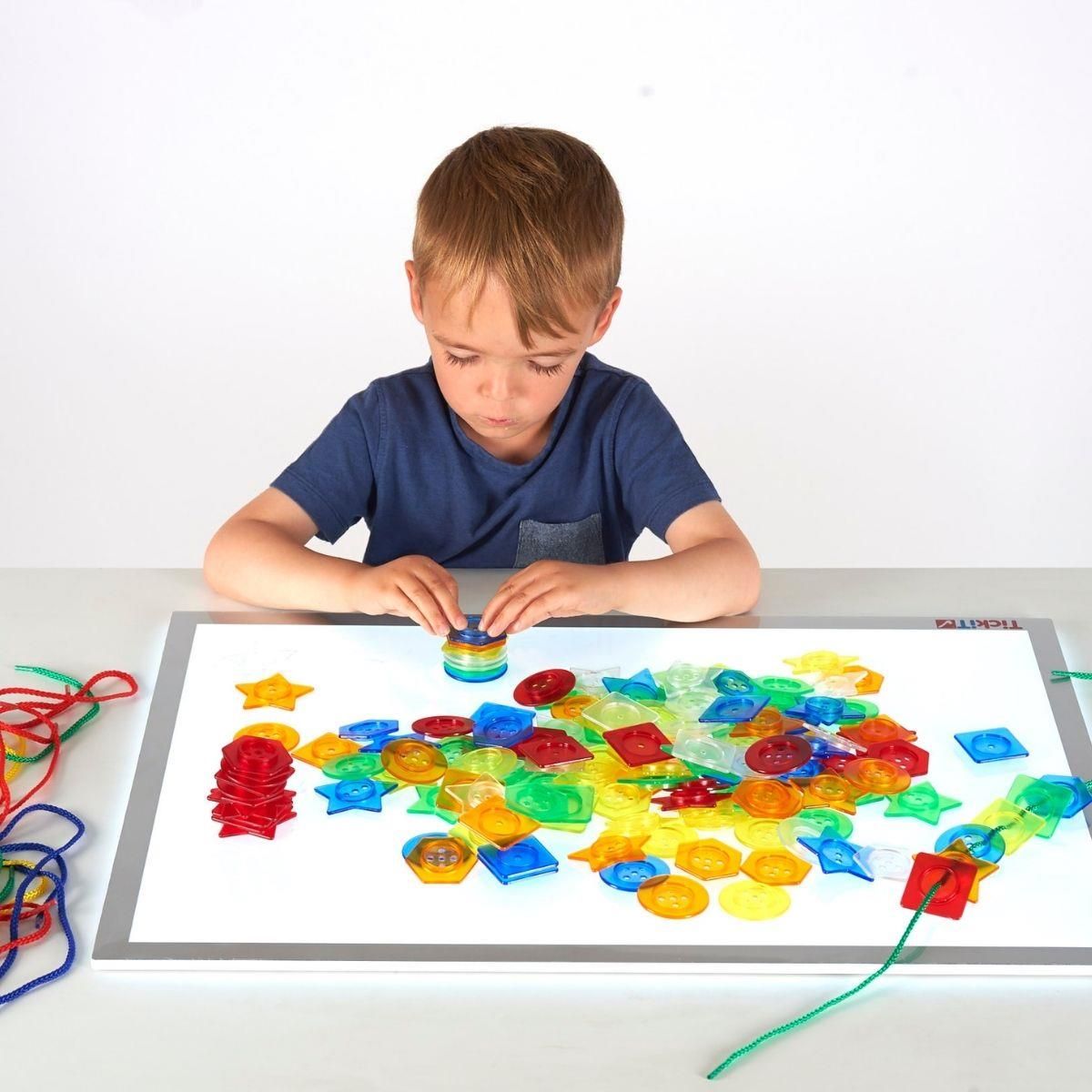 Dla kogo? Zestaw półprzezroczystych guzików o różnych kształtach, w 6 kolorach jednym, trzema lub pięcioma otworami pośrodku. Idealny do używania z panelem świetlnym. Pomocny w nauce sortowania i liczenia lub do rozwijania umiejętności motorycznych poprzez układanie lub nawlekanie za pomocą …