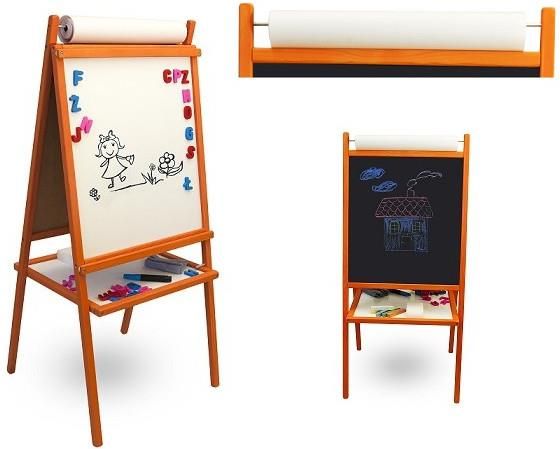 Średnia tablica kredowo-magnetyczna dwustronna drewniana - kolorowa z rolką papieru (20 m). Tablica zawiera zestaw magnetycznych liter oraz marker oraz gąbkę i polar do wycierania kredy i markera, 5 kolorów kredy. Wymiar produktu: 37 X 43,5 X 95 cm