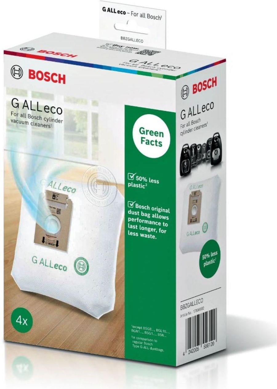 Bosch BBZGALLECO - 17008892 Specyfikacja techniczna: 50% mniej plastiku w porównaniu do standardowych worków Bosch G ALL.  Pasuje do wszystkich modeli odkurzaczy workowych* (*oprócz modeli BSG8..., BGL10..., BGN1..., BSG1..., BSN...)  Wydłużona żywotność odkurzacza - wysoki stopień zatrzymywania pyłu i precyzyjne dopasowanie worka zapewnia skuteczną ochronę silnika  Zawartość: 4 wymienne worki  Spełnia wymagania VDE SPEC 90005 V1.0: T1 – L