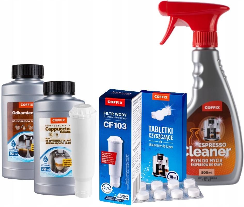 Zestaw do konserwacji do ekspresu MELITTA Zestaw do konserwacji ekspresu MELITTA spełni wszystkie wymagania twojego ekspresu w zakresie pielęgnacji. Dbaj o swój ekspres każdego dnia a odwdzięczy Ci się na długie lata pyszną ulubioną kawą. Zestaw zawiera: Filtr wody do ekspresu MELITTA NIVONA KRUPS SIEMENS BOSCH (zamiennik) Płyn do czyszczenia toru mleka COFFIX Cappuccino Cleaner 250 ml Odkamieniacz uniwersalny COFFIX ECO 250 ml Tabletki do czyszczenia ekspresu 10 szt – COFFIX Płyn do mycia ekspresów COFFIX Espresso Cleaner 500ml Filtr wody do ekspresu MELITTA NIVONA KRUPS SIEMENS BOSCH (zamiennik) Wysokiej jakości zamiennik filtra – jak Krups F088, Nivona NIRF700/701, Melitta ProAqua, Siemens TZ60003, Bosch TCZ6003. Oczyszcza wodę z drobin mechanicznych, metali ciężkich, pestycydów, wapnia. Dzięki specjalnej formule wkładu 20% lepsza** filtracja wody przeciwdziałająca osadzaniu kamienia w ekspresie. Odczuwalnie poprawia smak i zapach wody, co ma bardzo duże znaczenie przy zaparzaniu kawy. Zastosowanie filtra ułatwia otrzymanie idealnej w smaku, oczyszczonej wody, która jest pozbawiona osadów wapiennych, aby chronić urządzenie przed zakamienieniem. Odkamieniacz uniwersalny COFFIX ECO 250 ml Producent: COFFIX Przeznaczenie: Ekspresy do kawy / żelazka / inne AGD Ilość użyć: do 5 cykli Proporcje z wodą w użyciu: 1 : 10 Cel użycia: Usunięcie kamienia Zawartość pH: 1,7 – 3,0 Pojemność: 250ml Opakowanie: Plastikowa butelka Płyn do czyszczenia toru mleka COFFIX Cappuccino Cleaner 250 ml Producent: COFFIX Przeznaczenie: Ekspresy do kawy Ilość użyć: do 25 Cel użycia: Usuwanie pozostałości zaschniętego mleka i osadów mlecznych w ekspresie do kawy Zawartość pH: 13,0 – 14,0 Pojemność: 250ml Opakowanie: Plastikowa butelka Bardzo wydajny środek – jedno opakowanie wystarczy nawet na 25 cykli czyszczenia toru mleka w ekspresie do kawy. Tabletki do czyszczenia ekspresu 10 szt – COFFIX Uniwersalne tabletki czyszczące do usuwania osadów oleistych oraz tłuszczów w modułach zaparzania automatycznych ekspresów do kawy. Zastosowanie: ekspresy ciśnieniowe, przelewowe oraz kolbowe. Tabletki o wadze 2g, dzięki czemu precyzyjnie i skutecznie czyszczą zaparzacz każdego modelu ekspresu do kawy. Płyn do mycia ekspresów COFFIX Espresso Cleaner 500ml Profesjonalnie opracowany skład płynu sprawia, że ekspres do kawy odzyskuje świetny wygląd. Preparat skutecznie usuwa brud, pozostawiając lśniące, pozbawione smug, odcisków palców i zacieków powierzchnie oraz świeży zapach. Preparat zapobiega również ponownemu osadzaniu się kurzu. Dzięki wydajnemu dozownikowi uzyskujemy równomiernie pokrytą płynem powierzchnię. Najlepsze efekty daje regularne stosowanie i czyszczenie ściereczką z mikrofibry. Może być również stosowany do telewizorów, monitorów oraz gładkich powierzchni z tworzyw sztucznych.