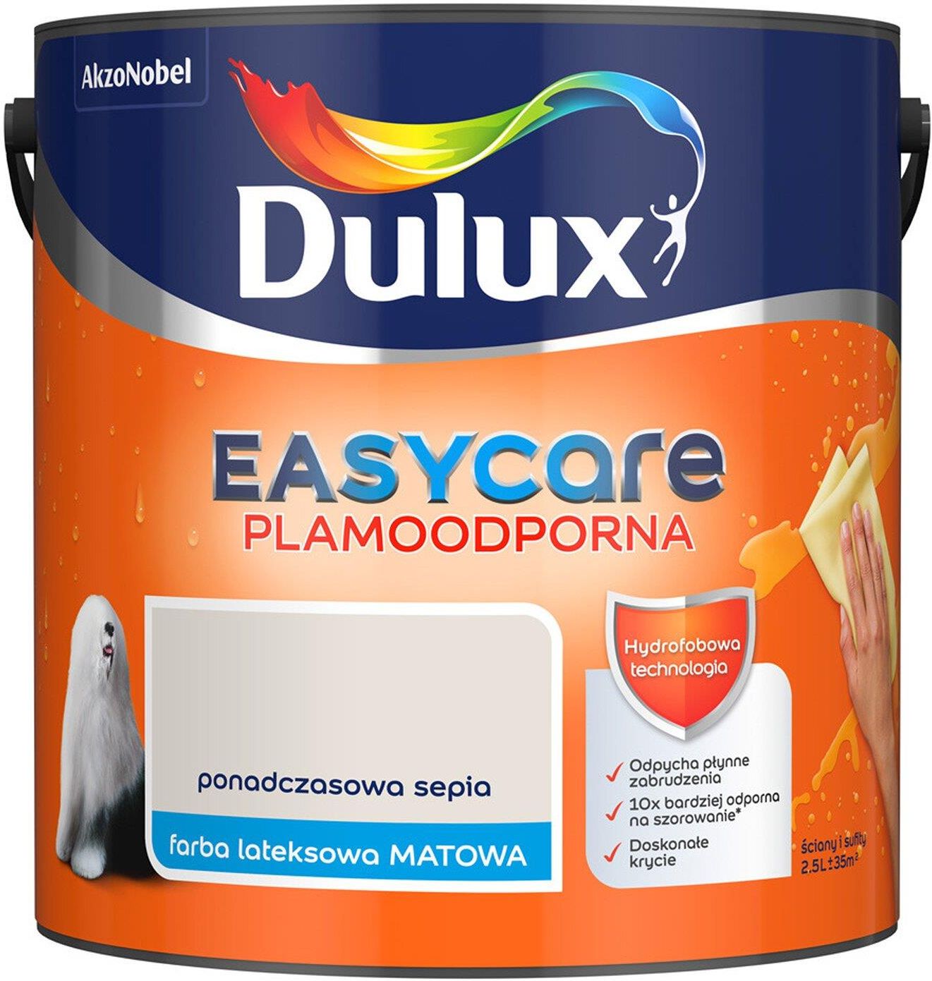 EASYCARE PONADCZASOWA SEPIA 2.5L Dulux EasyCare - Ponadczasowa Sepia, 2.5L - Pierwsza hydrofobowa i plamoodporna farba do ścian i sufitów. Zapewnia doskonałe krycie, matowe wykończenie oraz wyjątkową odporność na szorowanie. Ciepły, klasyczny odcień sepia dodaje wnętrzom elegancji i przytulności. …
