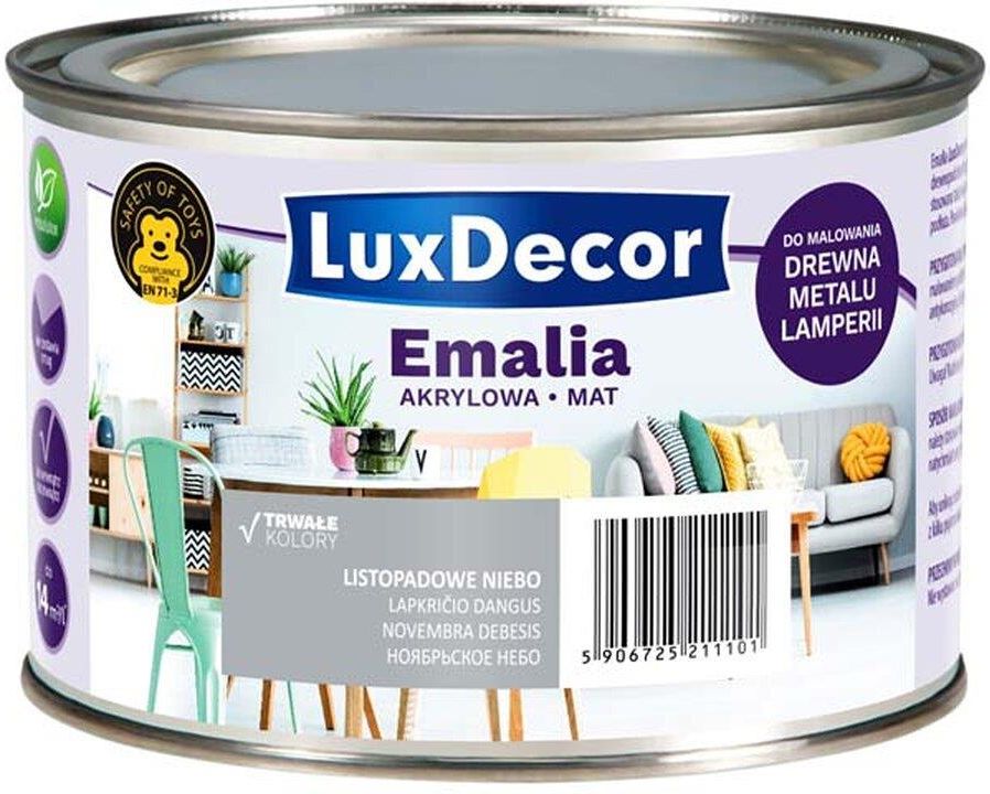 LuxDecor Emalia akrylowa do drewna i metalu mat listopadowe niebo 400 mlLuxDecor Emalia akrylowa to uniwersalna, wodorozcieńczalna emalia przeznaczona do dekoracyjnego malowania drewna, materiałów drewnopodobnych, gipsu i betonu. Nadaje się do stosowania wewnątrz i na zewnątrz pomieszczeń. Doskonale sprawdza się w czasie malowania lamperii, boazerii, mebli, okien oraz drzwi. Może być stosowana także na powierzchnie metalowe uprzednio zagruntowane farbą antykorozyjną.Emalia charakteryzuje się dobrym kryciem oraz doskonałą przyczepnością do podłoża. Powłoka odporna jest na działanie wody oraz niekorzystnych warunków atmosferycznych.