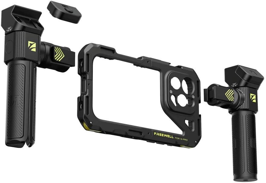 FREEWELL IPhone 16 Pro Genius Rig CECHY PRODUKTU Aluminiowa klatka operatorska kompatybilna z iPhone 16 Pro Max, Wygodny montaż całkowicie bez narzędzi, Klatka posiada mocowanie na filtry FREEWELL Sherpa oraz wymienny bagnet obiektywu FREEWELL F-Series, Dwie rączki typu side handle z możliwością …