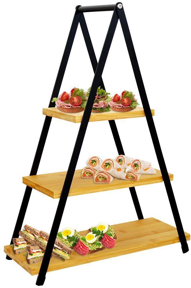 EFEKTOWNA - Patera do serwowania oraz ekspozycji. Patera ma wysokość 53 cm i trójkątny kształt. Idealna do ciast, tortów, owoców oraz wędlin, mięs, serów czy przekąsek. SOLIDNA - Konstrukcja została wykonana z metalu w czarnym kolorze. Poziomy pater zostały wykonane z drewna bambusowego. Usadowiona …