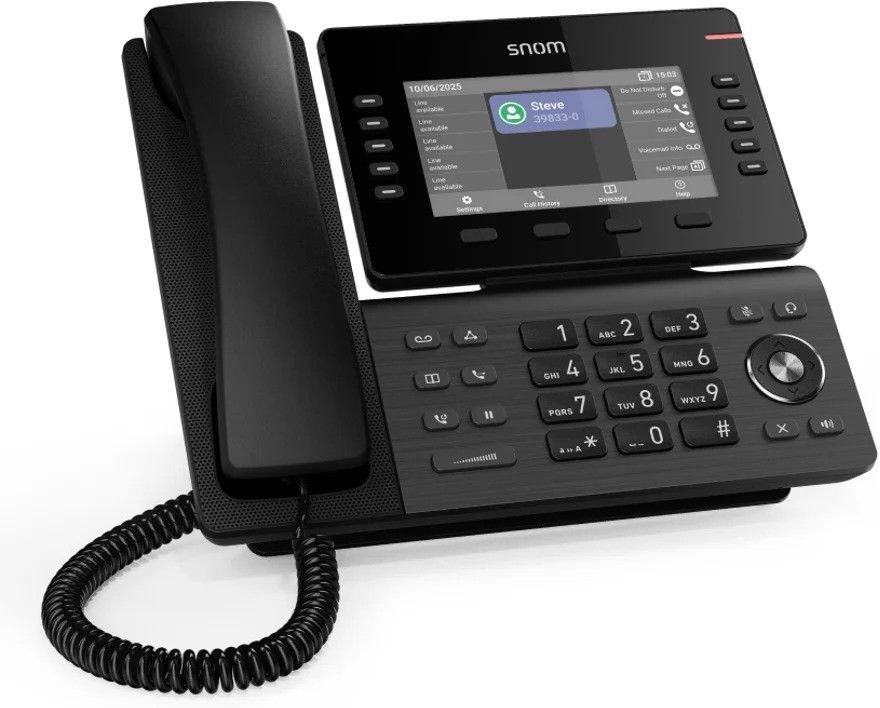 Snom D815WB. Typ produktu: IP Phone, Kolor produktu: Czarny. Typ ekranu: IPS, Długość przekątnej ekranu: 12,7 cm (5"), Rozdzielczość: 480 x 272 px. Częstotliwość mikrofonu: 100 - 80000 Hz, Kodeki glosu: G.711a, G.711ulaw, G.722, G.723.1, G.726, G.729ab, GSM 6.10. Typ interfejsu Ethernet LAN: Gigabit Ethernet, Standardy Wi- Fi: Wi-Fi 4 (802.11n), Wi-Fi 5 (802.11ac), Protokoły VoIP: SIP, SDP, RTP, RTCP, RTCP-XR, SIP REFER method (RFC 3515), rport (RFC 3581), ENUM, ICE, STUN. Wtyk słuchawek z mikrofonem: RJ-9