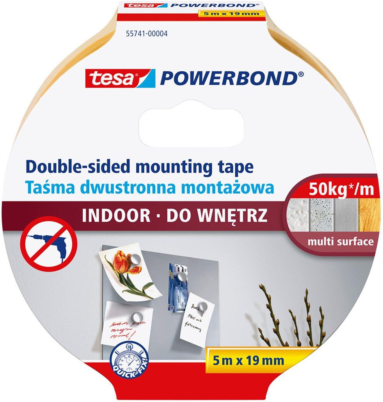 Tesa Taśma montażowa do wnętrz Powerbond 5 m x 19 mm Taśma tesa® Powerbond do wnętrz idealnie nadaje się do trwałego montażu tynków dekoracyjnych i małych półek na wielu różnych powierzchniach wewnątrz budynku. Drobne nierówności powierzchni nie stanowią problem, ponieważ ulegają wyrównaniu. Tak prosta w użyciu, wystarczą nożyczki i kilka minut. Pasek taśmy o długości 10 cm może utrzymać ciężar do 5 kg, możesz zatem mieć pewność, że zamocowany przedmiot nie spadnie.