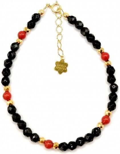 Bransoletka wykonana ze srebra próby 925, pozłacanego 24 karatowym złotem Kamień: Koral + Turmalin i Hematyt Rozmiar kamienia: 4/2mm Długość: 17,5 cm Zapięcie: federing Bransoletka może być wykonana na gumce- prosimy o informację w uwagach do zamówienia Biżuteria ręcznie wykonana, produkt Polski.