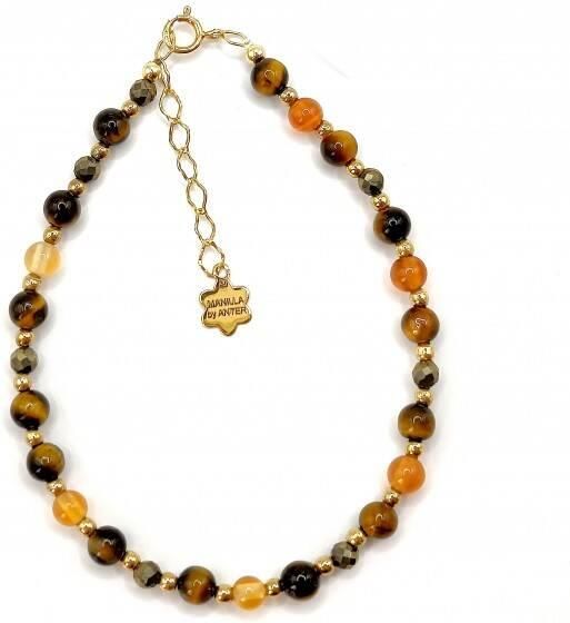 Bransoletka wykonana ze srebra próby 925, pozłacanego 24 karatowym złotem Kamień: Tygrysie oko + Piryt + Kamień słoneczny i Hematyt Rozmiar kamienia: 4/3/2mm Długość: 17,5 cm Zapięcie: federing Bransoletka może być wykonana na gumce- prosimy o informację w uwagach do zamówienia Biżuteria ręcznie wykonana, produkt Polski.
