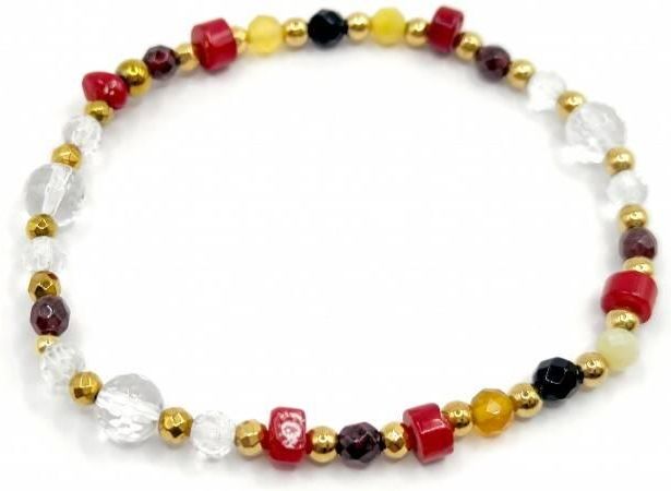 Bransoletka wykonana ze srebra próby 925, pozłacanego 24 karatowym złotem. Kamień: Kryształ+ Koral + Granat i Hematyt Rozmiar kamienia: 6/4/2mm Długość: 17,5 cm Zapięcie: gumka Bransoletka może być wykonana na zapięciu- prosimy o informację w uwagach do zamówienia Biżuteria ręcznie wykonana, produkt Polski.