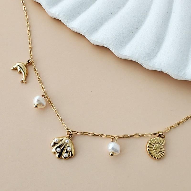 Upominkarnia Bransoletka na stopę stal chirurgiczna pozłacana 14k złotem, muszle perły - BST1562 Rumia