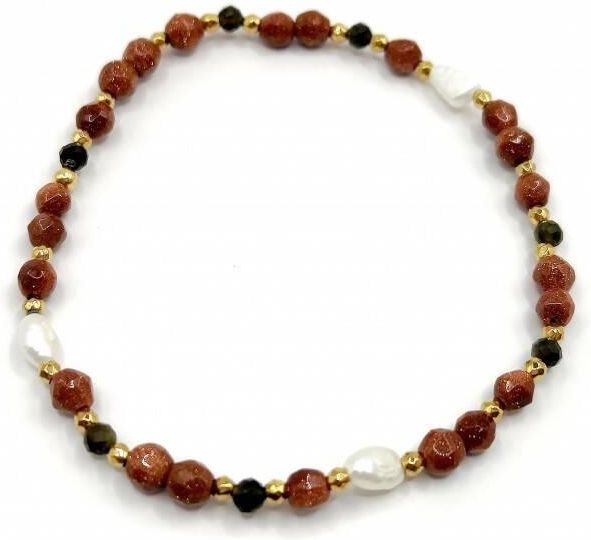 Bransoletka wykonana ze srebra próby 925, pozłacanego 24 karatowym złotem. Kamień: Piasek pustyni + Spinel + Perła i Hematyt Rozmiar kamienia: 4/3/2mm Długość: 17,5 cm Zapięcie: gumka Bransoletka może być wykonana na zapięciu- prosimy o informację w uwagach do zamówienia Biżuteria ręcznie wykonana, produkt Polski.