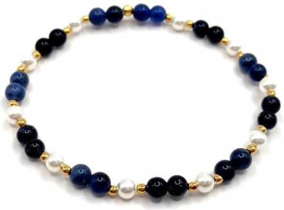 Bransoletka wykonana ze srebra próby 925, pozłacanego 24 karatowym złotem. Kamień: Sodalit + Perła i Hematyt Rozmiar kamienia: 4/2mm Długość: 17,5 cm Zapięcie: gumka Bransoletka może być wykonana na zapięciu- prosimy o informację w uwagach do zamówienia Biżuteria ręcznie wykonana, produkt Polski.