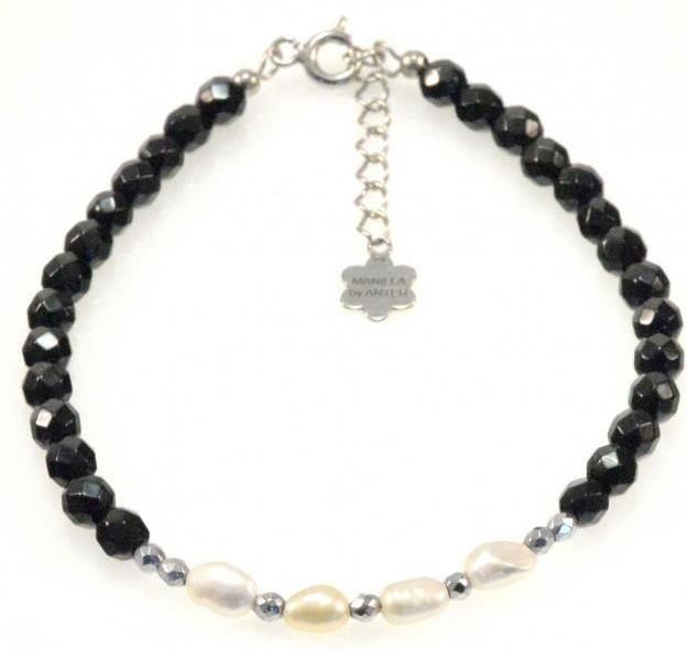 Bransoletka wykonana ze srebra próby 925 , pozłacanego 24 karatowym złotem Kamień: Spinel, Perła i Hematyt Rozmiar kamienia: 3mm / 4mm Długość: 17,5 cm + przedłużka do 19,5 cm
