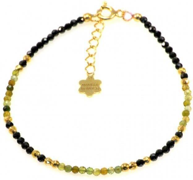 Bransoletka wykonana ze srebra próby 925 , pozłacanego 24 karatowym złotem Kamień: Spinel, Turmalin i Hematyt Rozmiar kamienia: 2 mm Długość: 17,5 cm + przedłużka do 19,5 cm