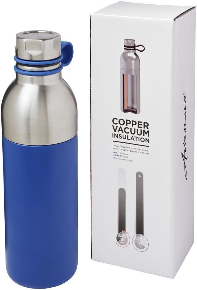Miedziany izolowany próżniowo bidon Koln o pojemności 590 ml Stan: Nowy Wymiary (cm): 25,2 x Ø 7,5 Kolory: Niebieski Materiał: Stal nierdzewna Dwuwarstwowa próżniowa konstrukcja ze stali nierdzewnej i miedziana izolacja zapewniają utrzymanie niskiej temperatury napojów przez 48 godzin i wysokiej przez co najmniej 12 godzin. Konstrukcja zapobiega również kondensacji na zewnątrz butelki. Posiada zakręcaną pokrywę górną ze stali nierdzewnej z wygodną silikonową pętlą do przenoszenia. Otwierana z dwóch stron konstrukcja ułatwiająca czyszczenie i napełnianie. Pojemność 590ml. Zapakowany w pudełko upominkowe Avenue.