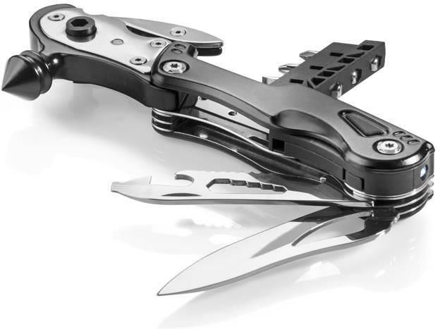 Narzędzie wielofunkcyjne ESCAPE 29139 Czarne Stan: Nowy Kolor: Czarny Wymiary (cm): 158 x 68 x 24 mm (złożony) Kolory: Czarny Waga (kg): 0.3650 ESCAPE to niezbędne wyposażenie każdego samochodu, które warto mieć zawsze pod ręką. Zawiera aż 11 funkcji w jednym narzędziu z czego najważniejszymi są zbijak do szyb oraz przecinak do pasów bezpieczeństwa. Dodatkowo posiada takie funkcje jak: latarka, nóż, komplet 3 bitów, dwukierunkowy uchwyt na bity, uniwersalny klucz sześciokątny, płaski śrubokręt, piłę oraz otwieracz do butelek i puszek. W komplecie znajduje się również czarny, materiałowy pokrowiec na narzędzie.