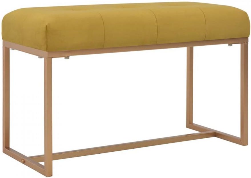 Nasza ławka będzie świetnym dodatkiem do wystroju salonu, przedpokoju lub holu. Pokryte aksamitem w musztardowym kolorze siedzisko będzie miękkie i przyjemne w dotyku, doda także nieco koloru do wystroju wnętrza. Dodatkowo malowane proszkowo żelazne nogi zapewnią stabilność i trwałość konstrukcji. Nasza ławka do przedpokoju w elegancki sposób ozdobi przestrzeń stając się nieodzownym elementem wyposażenia wnętrza. Montaż pokrytej aksamitem ławki jest prosty. Kolor: musztardowy i złoty Materiał: siedzisko z pokryciem z aksamitu i żelazna rama malowana proszkowo Wymiary: 80 x 36 x 45 cm (szer. x gł. x wys.) Materiał: Poliester: 100%