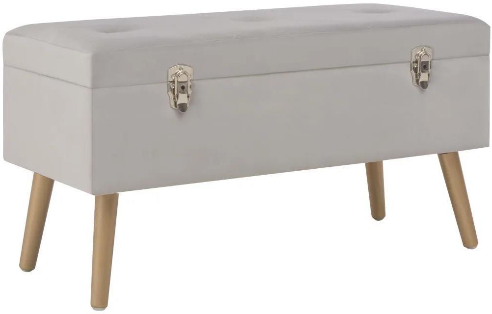 Pokryta aksamitem ławka będzie przyciągającym wzrok dodatkiem do wystroju Twojego salonu, przedpokoju lub holu. Pokrycie z szarego aksamitu jest miękkie i przyjemne w dotyku, doda także nieco koloru do wystroju wnętrza. Wewnętrzna przestrzeń do przechowywania oferuje dodatkowe miejsce na różne przedmioty. Co więcej, drewniane nogi w złotym kolorze zapewniają stabilność i trwałość konstrukcji. Ta ławka zaczaruje przestrzeń w Twoim mieszkaniu, stając się nieodłączną częścią jego wyposażenia. Kolor: szary i złoty Materiał: aksamit, lite drewno sosnowe Wymiary: 80 x 34 x 42 cm (szer. x gł. x wys.) Z wewnętrznym schowkiem