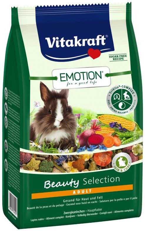 Emotion Beauty to pokarm przystosowany do potrzeb gatunku, wysokowartościowy, zrównoważony, sporządzony wyłącznie z naturalnych składników. Zawiera bogate w białko pędy słonecznika bulwiastego, włókno strukturalne (lucerna), owoc dzikiej róży (witaminy) i VitaGerm- wysokowartościowy pakiet wzmacniających naturalną energię substancji czynnych uzyskanych z tłoczonych na zimno kiełków pszenicy. Emotion Beauty - dodatkowe korzyści: -OMEGA 6 BEAUTY COMPLEX ? zawiera wartościowe esencjonalne kwasy tłuszczowe (olej słonecznikowy) ? wspomaga zdrowie skóry i sierści. -HAIR-COMPLEX - zapewnia lśniącą sierść. -WELLNESS-COMPLEX - wzmacnia odporność. -DENTAL-PROPHYLAXE - gwarantuje zdrowe zęby.Skład: roślinne produkty uboczne (lucerna 14%), zboże (płatki kukurydzy 12%), warzywa (marchew 3,6% ), owoce , melasa z trzciny cukrowej, składniki mineralne, oleje i tłuszcze, koncentrat aloesowy - aloe vera. Dodatkowe składniki na 1kg: 8.168 i.E. witaminy A; 937 i.E. witaminy D3; 38,9 mg witaminy E; 269mg witaminy C; 5,7mg witaminy B1; 6,9mg witaminy B2; 4,6mg witaminy B6; 10,9?g witaminy B12; 54,8mg kwasu nikotynowego; 18,6mg kwasu pantotenowego; 288?g biotyny; 4,3mg kwasu foliowego; 163 mg choliny; 14,6mg miedzi jako siarczan miedzi II, pentahydrat, 53g cynku jako tlenek cynku i siarczanu cynku II, monohydrat. Barwione za pomocą substancji dodatkowych EG. Analiza: proteiny 14%; tłuszcze 4%; włókno 13,5%; popiół 5,5%; wilgotność 10%; wapń 0,70%; fosfor 0,45%. Podawanie: niewielką ilość pokarmu nasypać do pojemniczka i zapewnić zwierzęciu stały dostęp do świeżej wody.