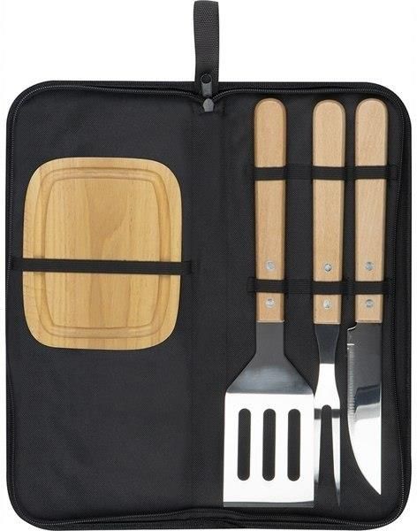 Zestaw do grillowania zapakowany w czarne etui. Zestaw składa się z: noża, łopatki, widelca - wszystko ze stali nierdzewnej, deski z bambusa oraz rękawicy.