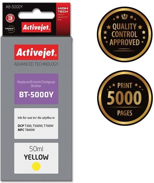 AB-5000Y Tusz do drukarki Brother zastępuje tusz Brother BT-5000Y Kompatybilność Brother DCP T300, Brother DCP T500W, Brother DCP T700W, Brother DCP T310, Brother DCP T510W, Brother DCP T710W, Brother MFC T800W, Brother MFC T910W, Brother DCP T720DW, Brother MFC T920DW, Brother DCP T426W Zachwycające kolory  Tusz Activejet AB-5000Y do Brother BT-5000Y zapewnia nam idealne odwzorowanie kolorów. Ciesz się głębokimi i przenikliwymi barwami, kiedy tylko tego potrzebujesz. Wydruk będzie wyglądał dokładnie tak jak tego oczekujesz.  Pełna kompatybilność  Activejet AB-5000Y do Brother BT-5000Y to produkt stworzony z myślą o twojej drukarce. Jego używanie nie powoduje skrócenia lub utraty gwarancji. Nie napotkasz też żadnych problemów z samym drukowaniem. Wszystko będzie działać dokładnie tak jak powinno.  Prosta instalacja  Instalacja tuszu Activejet AB-5000Y do Brother BT-5000Y w drukarce zajmie ci zaledwie kilka minut. Cały proces jest wygodny i niezwykle intuicyjny. Nie potrzebujesz również żadnej specjalistycznej wiedzy.  Miej wszystko pod kontrolą  Dzięki prawidłowo działającemu wskaźnikowi poziomu tuszu w pojemniku nigdy nie zaskoczy cię jego nagłe wyczerpanie. Drukarka w odpowiednim momencie poinformuje cię o tym, że zbliża się czas jego wymiany. Miej wszystko idealnie pod kontrolą!  Dane techniczne Kolor: Żółty Pasuje do urządzeń: Brother Rodzaj naboju z atramentem: Wysoka (XL) wydajność Ilość wkładów z kolorowym tuszem: 1 Pojemność kolorowego tuszu: 50 ml Eksploatacja kompatybilna: Brother BT-5000Y Model: Zamiennik Rodzaj atramentu: Atrament barwnikowy Rodzaj opakowania: Pudełko Klasa: A+ Zastępuje: Brother Technologia: New Wersja: Supreme Rodzaj dostawy: Jednopak Certyfikaty: ISO 9001, ISO 14001, ISO 27001, ISO 28000, TÜV Rheinland (ISO/IEC 19752, ISO/IEC 19798), CE Opis blokowy: Activejet Tusz Rodzaj tuszu kolorowego: Atrament barwnikowy EAN: 5901443110644