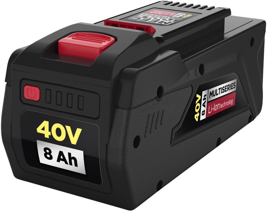 Akumulator do narzędzi z serii Meec Tools Multiseries 40 V. Akumulator komunikuje się z urządzeniem, odpowiednio dostosowując moc, co zapewnia mu dłuższą żywotność i większą siłę. Ładowarka do kupienia osobno.