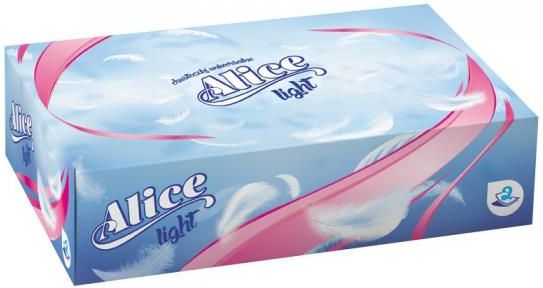 Dwuwarstwowe chusteczki higieniczne Alice light w 100% wyprodukowane z celulozy. Chusteczki nie podrażniają skóry, są miękkie, wytrzymałe i przyjazne dla skóry. Chusteczki kosmetyczne posiadają wygodne opakowanie, które można postawić w dowolnym miejscu. Opakowanie zawiera: 100szt