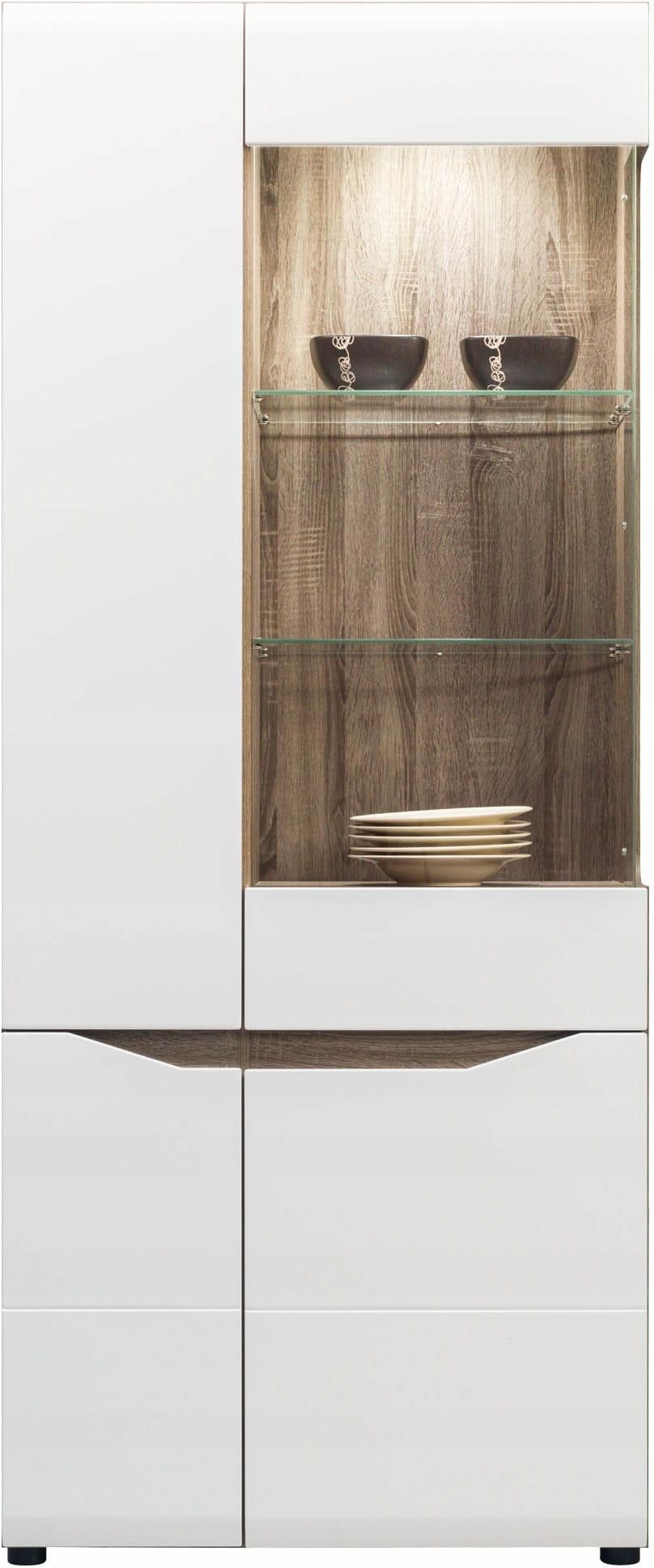 Witryna LIONEL LI7 BogFran Wysoka witryna z systemu mebli Lionel to doskonałe uzupełnienie wystroju Twojego salonu. Dwudrzwiowa, z asymetrycznym frontem, posiada przeszklenie umieszczone w szerszych drzwiczkach. Za zamykanymi drzwiami z zawiasami z systemem cichego domykania znajdują się pojemne półki umożliwiające przechowywanie rzeczy, których eksponować nie chcemy. Dane techniczne Mebel przeznaczony do samodzielnego montażu, Oświetlenie LED dostępne jako osobny produkt, Funkcja cichego domyku, LIONEL LI7 został wykonany z płyty meblowej oraz płyty MDF, w kolorze dębu truflowego oraz białym. Wymiary -Szerokość: 80 cm -Głębokość: 40,5 cm -Wysokość: 193 cm Witryna LIONEL LI7 została wykonana z płyty meblowej oraz płyty MDF, połączenie obu tych materiałów sprawia że, mebel jest solidny oraz wytrzymały, Korpus wraz blatem został wykonany z płyty meblowej, która została pokryta laminatem, którego zadaniem jest ochrona przed zarysowaniami, Fronty zostały wykonane z płyty MDF pokryte folią PVC, dzięki swoim właściwościom folia ta chroni fronty przed zabrudzeniami i wilgocią oraz nadaję im połysku. Charakterystyka systemu Lionel Korpus wykonany jest z płyty wiórowej laminowanej o grubości 16 mm. Blat korpusu wykonany jest z płyty wiórowej laminowanej o grubości 16 mm Korpus obrzeże ABS 0,5 mm Fronty wykonane z płyty MDF o grubości 18 mm Fronty oklejone folią ( PCV ) Półki wewnętrzne wykonane z płyty wiórowej laminowanej o grubości 16 mm Półki wiszące wykonane z płyty MDF 18 mm. oraz z płyty wiórowej laminowanej 16 mm Półki wiszące obrzeże ABS 0,5 mm. / 2 mm Blat ławy wykonany jest z płyty wiórowej laminowanej o grubości 32 mm Zawiasy ᵩ 35 regulowane w trzech płaszczyznach Stopki plastikowe Uchwyty frezowane Hartowane szkło szyb frontowych. ( bezbarwne ) System cichego domyku drzwi w standardzie ( TITUS ) System cichego domyku szuflad w standardzie