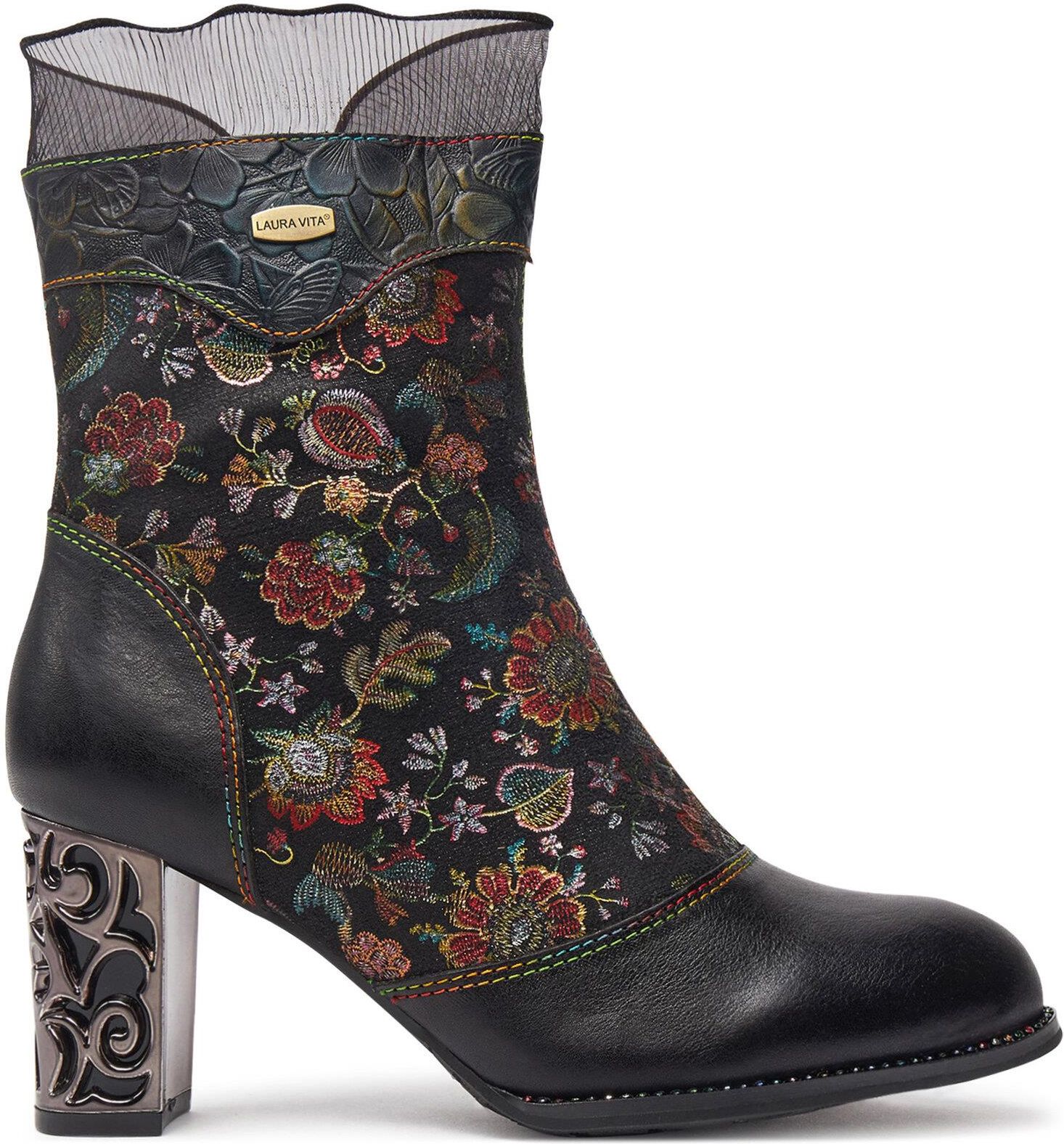 Botki Laura Vita to idealny wybór dla kobiet, które szukają oryginalnego stylu i wygody. Wykonane z naturalnej skóry, przyciągają uwagę kwiatowym wzorem na cholewce i kolorowymi szwami. Ich unikatowy design podkreśla także falbanka na górnej krawędzi. Stabilny obcas zapewnia komfort podczas noszenia, a suwak ułatwia zakładanie. Miękka, amortyzująca skórzana wkładka dba o wygodę stóp przez cały dzień. Idealne do codziennych i eleganckich stylizacji z nutą artystycznej swobody.