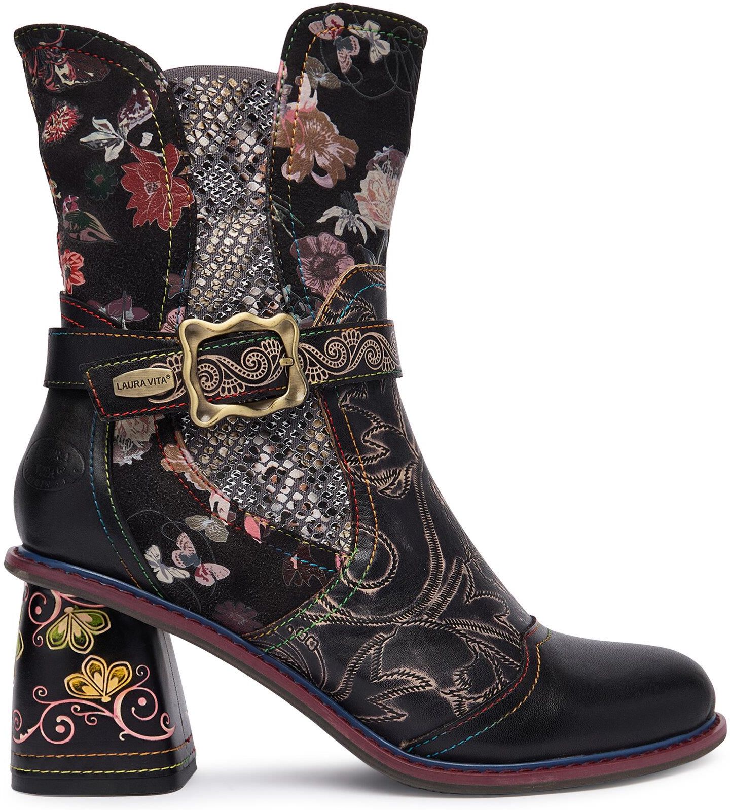 Botki damskie skórzane kozaki na słupku Laura Vita EVCAO 82 czarne r.39 Płeć: Damskie Kolor: Czarny Wysokość: Wysokie Materiał: Skóra naturalna Podeszwa: Wysokogatunkowe tworzywo Rodzaj zapięcia: Suwaki Dodatkowe informacje: Sztywny zapiętek, Wkładka skórzana Stan: Nowy Botki damskie skórzane Laura Vita EVCAO 82 NOIR Kolor: Czarny Wyskokie botki damskie francuskiej marki Laura Vita cechuje niepowtarzalne wzornictwo, stylistyka wyprzedzająca trendy oraz komfort zamknięty w doskonałej formie, wykonanej z wysokiej jakości materiałów z dużą dbałością o detale. Są nie tylko oryginalne i eleganckie, ale też bardzo wygodne. Cholewka butów została wykonana z wysokogatunkowej skóry naturalnej. Na cholewce wytłoczony grawer z pięknym motywem kwiatowym. Oryginalny i niepowtarzalnie zdobiony obcas na słupku gwarantuje stabilność i nie obciąża stopy. Miękka wkładka z naturalnej skóry sprawia, że buty gwarantują wygodę podczas chodzenia. Boczne zapięcie na suwak umożliwia szybkie i łatwe zakładanie butów. To świetne buty nie tylko na wyjście ze znajomymi ale także cały dzień „na nogach”.. Doskonale pasują do casualowych lub eleganckich spodni w różnych stylach, ale również do stylizacji z udziałem spódnic lub sukienek. Wysokość cholewski: 16,5 cm, obcas: 7,5 cm Rozmiar i dł. wkładki wewnętrznej Wymiary , granica błędu 1-2mm 36 - 23,5 cm 37 - 24,0 cm 38 - 25,0 cm 39 - 25,5 cm 40 - 26,0 cm 41 - 26,5 cm