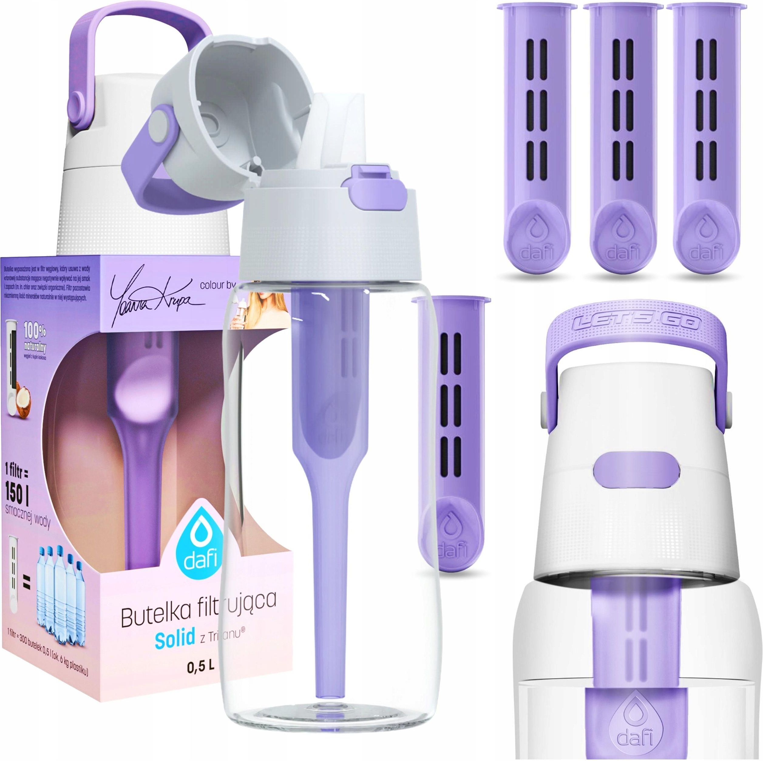 Bidon Filtrujący DAFI SOLID 0,7L Lawenda by Joanna Krupa +5 FILTRÓW BUTELKA Poręczna, wygodna i ergonomiczna, Oryginalny kolor zaprojektowany przez Joannę Krupę. Wykonana z wytrzymałego Tritanu™, całkowicie pozbawiona szkodliwego Bisfenolu A i dopuszczona do kontaktu z wodą na podstawie odpowiednich atestów. Wyprodukowana w Polsce. Posiada filtr węglowy, który usuwa z wody kranowej nieprzyjemny smak i zapach chloru. Zaprojektowana dla osób, które doceniają rolę regularnego nawadniania organizmu, uprawiają sport i praktykują zdrowy styl życia. Optymalna pojemność 700 ml, dzięki czemu możesz mieć ją zawsze przy sobie nie martwiąc się o konieczność kupowania wody w jednorazowych opakowaniach. Jeden filtr zapewnia nam do 150 l wody miesięcznie i zastępuje 300 półlitrowych jednorazowych opakowań. Zestaw z 3 zapasowymi wkładami węglowymi! + 1 znajdujący się w butelce Zestaw na 4 miesiące! Butelka filtrująca - wymienny filtr węglowy Poręczna butelka wielokrotnego użytku wyposażona jest w wymienny co miesiąc filtr węglowy (naturalne medium filtrujące wytwarzane z łupin orzecha kokosowego). Wymienny filtr do butelki sprawia, że woda kranowa staje się smaczna i idealna do picia. Pozostawia niezmienioną ilość minerałów naturalnie w niej występujących (głównie wapnia i magnezu), dzięki czemu woda zachowuje cenne dla zdrowia pierwiastki. Lekko podwyższa pH wody, co przekłada się na jej jakość. Aplikacja MOJE DAFI Z aplikacją MOJE DAFI nie zapomnisz o regularnej wymianie filtra w Twojej butelce! PRZYPOMNIENIE Otrzymuj powiadomienia o zbliżającym się terminie wymiany wkładu. KONTROLA WYDATKÓW Dowiedz się, ile zaoszczędzisz miesięcznie i rocznie filtrując wodę kranową z produktami Dafi. PERSONALIZACJA Dodawaj swoje produkty, nadawaj im własne nazwy i kontroluj zużycie filtrów dla każdego z nich. Jeden filtr zapewnia nam do 150 l wody miesięcznie i zastępuje 300 półlitrowych jednorazowych opakowań. Dzięki butelce filtrującej DAFI: zmniejszamy liczbę odpadów przyczyniamy się do ochrony środowiska oszczędzamy pieniądze i miejsce. Przemyślana i ergonomiczna konstrukcja bidonu Hipoalergiczny ustnik wykonany z bezpiecznego silikonu Szczelne zamknięcie chroniące przed zabrudzeniem ustnika OneTouch wygodny przycisk szybkiego otwierania Wygodny uchwyt do przenoszenia Szeroki otwór do łatwego napełniania Naturalny filtr węglowy usuwający z wody kranowej nieprzyjemny smak i zapach chloru Wygodna rurka pozwalająca na wypicie wody do samego końca przez przychylania butelki Butelka filtrująca - idealne rozwiązanie w każdej sytuacji Bidon SOLID świetnie sprawdzi się: na siłowni do szkoły na wycieczkę, spacer do pracy podczas biegania w domu Parametry techniczne Pojemność: 0,7 l Kolor: Lavender/fioletowy Wysokość: 284 mm Średnica: 76 mm Mycie w zmywarce: tylko zbiornik Wydajność filtra: miesiąc lub do 150 l wody (w zależności od jej jakości) Dodatki 3 Zapasowe wkłady węglowe!
