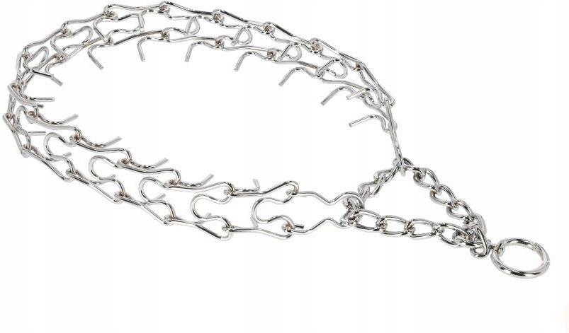 Kolczatka dla psa wykonana z wysokiej jakości metalowego drutu. Pokrycie obroży chromem sprawia, że jest ona bardzo wytrzymała. Kolczatka jest zaciskowa, co potęguje szkoleniowy efekt. Kolczatkę można regulować w zależności do swoich potrzeb poprzez wyjęcie lub dodanie pojedynczych ogniw, które również są dostępne w naszej ofercie - sprawdź w produktach powiązanych. Rozmiary dostępne w naszej ofercie: Ø 3,0 mm x 36 - 46 cm, rozmiar M Kolczatka spełnia behawioralną funkcję i należy używać jej rozsądnie. Jeśli Twój pies ciągnie na smyczy, polecamy szelki Easy Walk dostępne w naszej ofercie.Nauczą go one poprawie chodzić na smyczy. Kolec w kolczatce M jest ułożony pod kątem ostrym i wysyła mocniejszy bodziec w szyję psa psa przy szarpnięciu. Polecany jest do szkolenia psów z długim włosem. Jeśli uważasz, że spacer z psem w kolczatce nie będzie niczym zakłócony, odwróć ją kolcem do góry, niech Twój pupil ma przyjemność ze spacerowania. Wtedy kolczatka pełni rolę zwykłej obroży zaciskowej.