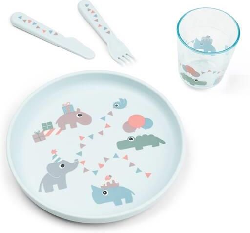 Done by Deer Zestaw Obiadowy Foodie Celebration Blue Numer kat. 1546102 Ten uroczy zestaw obiadowy Foodie w kolorze pudrowym idealnie nadaje się docelebrowania kazdego posiłku! Zestaw zawiera talerz, kubeczek, nóż, widelec i małą książeczkę, wszystkie produkty pieknie ozdobione uroczym motywem …