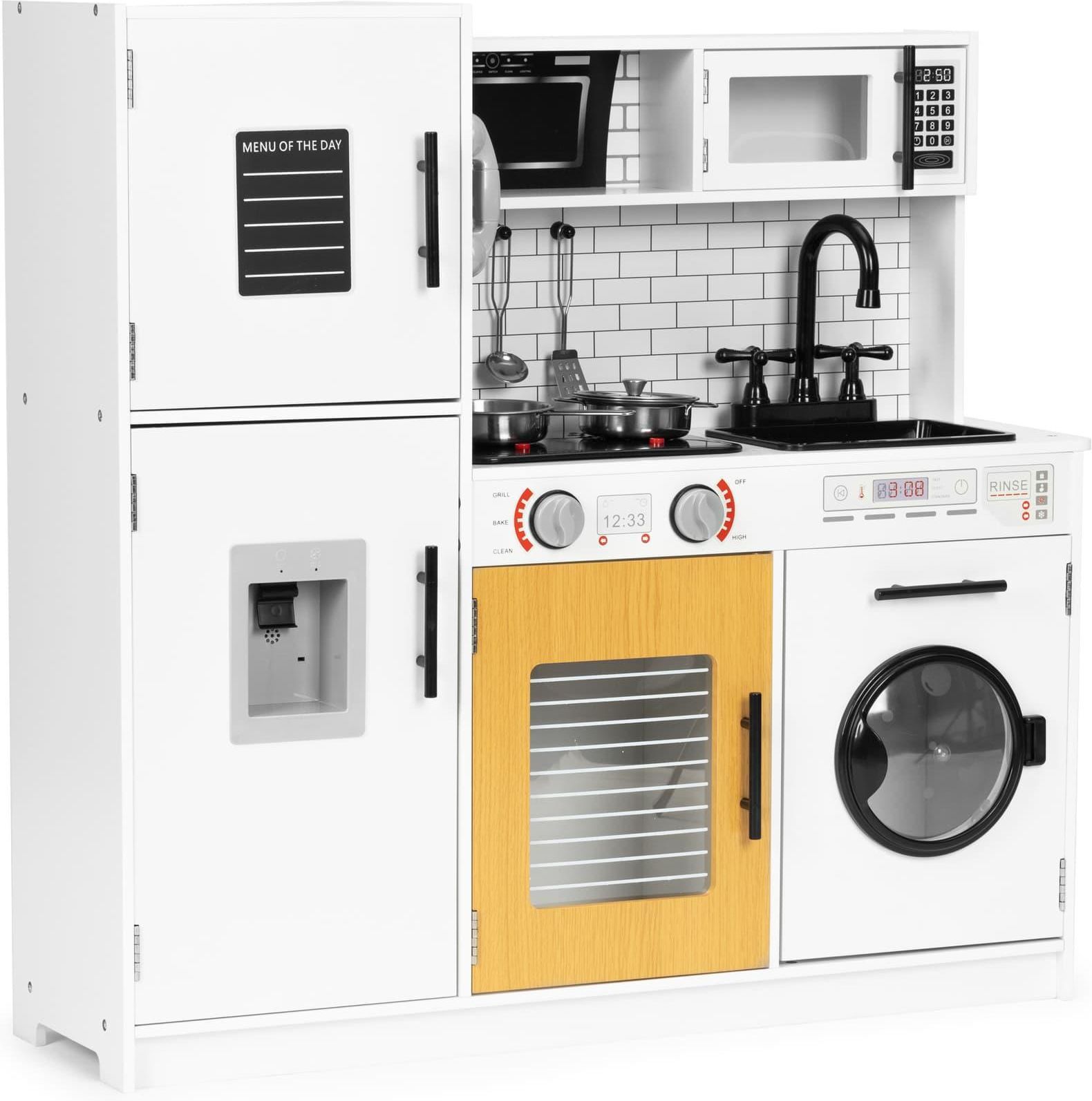 DREWNIANA KUCHNIA DLA DZIECI Z AKCESORIAMI Dla dzieci powyżej 3 roku życia Idealna zabawka do odgrywania roli kucharza lub kucharki Efekty świetlne oraz dźwiękowe Drewniana, solidna konstrukcja Otwieranedrzwi lodówki, piekarnika, mikrofalówki oraz pralki Mała tablica kredowa na drzwiach lodówki …