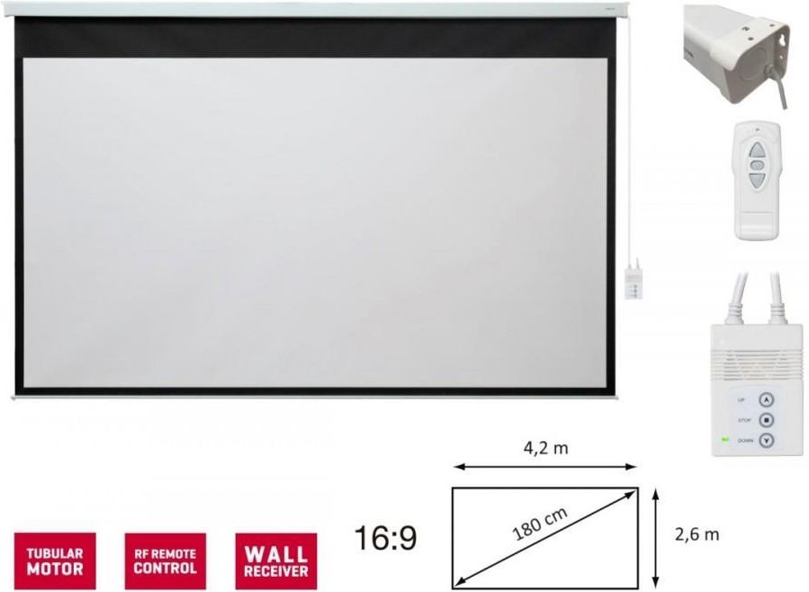 Fonestar PPEL-16180-FA - Elektryczny ekran projekcyjny 16:9, przekątna 180', pilot Ekran projekcyjny 16:9, 180" (4,2 x 2,6 m) z napędem elektrycznym i bezprzewodowym pilotem w zestawie Ekran projekcyjny zasilany elektrycznie, wykonany z najwyższej jakości materiału trudnopalnego o grubości 0,46 mm, wzmocnionego włóknem PVC. Regulowana praca dla ekranów o różnych rozmiarach. nadaje się do montażu na ścianie lub suficie. Idealne rozwiązanie do klas, sal konferencyjnych, itp. Matowa, biała powierzchnia projekcyjna z czarną ramką o szerokości 6 cm + dodatkowe 30 cm czarnej krawędzi górnej. Czarny tył. PVC - zysk Format 16:9, 180" (przekątna 4,2 m x 2,6 m). Wymiary po złożeniu: 426 x 10,6 x 10,6 cm głębokości Waga: 27,5 kg Możliwy montaż na ścianie i suficie. Obudowa zaokrąglona. Cichy i szybki napęd rurowy. Silnik synchroniczny, obudowa zaokrąglona, ​​przyciski sterujące góra, dół i stop. W zestawie pilot RF, możliwość regulacji działania.