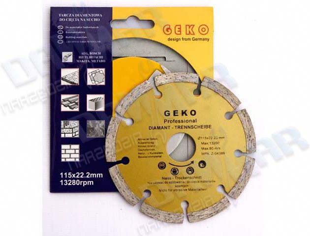 TARCZA DIAMENTOWA SEGMENTOWA 300x8x32mm GEKO Kod: G00254 Producent: GEKO Dostępność: produkt dostępny CHARAKTERYSTYKA: Profesjonalna tarcza diamentowa segment zaprojektowana do cięcia betonu, granitu, kamienia, marmuru i innych twardych materiałów budowlanych. Cechy produktu: średnica - 300 mm otwór montażowy - 32 mm wysokość nasypu 8 mm wysoka koncentracja diamentu