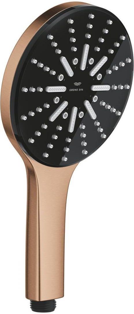 Grohe słuchawka prysznicowa 3 strumienie brushed warm sunset 101676DL00 O PRODUKCIE akrylowa tarcza natrysku, czarna strumień GROHE Rain, Rain+ i ActiveMassage GROHE SmartTip wybór strumienia natrysku przez naciśnięcie pierścienia na słuchawce GROHE EcoJoy mniejsze zużycie wody maksymalne natężenie …