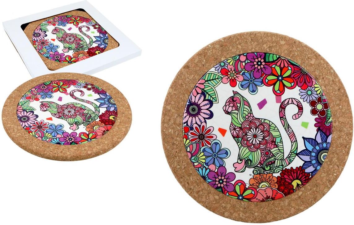 Podstawka pod gorący garnek, patelnię lub dzbanek marki Hanipol. Podkładka jest ceramiczno - korkowa. Na ceramicznej części podkładki widnieje motyw zielono-różowego, siedzącego kota na tle kolorowych kwiatów. Średnica podkładki 19,5 cm. Praktyczna i wygodna podstawka pod gorące naczynia, dzięki …