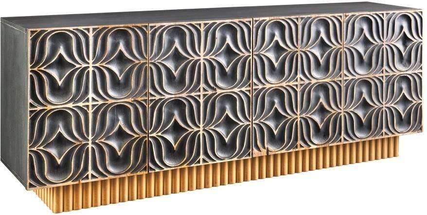 KOMODA PIAZZA SAN MARCO 177X38 CM MANGO NIEBIESKO-SZARA Ta prostokątna elegancka komoda idealnie wpisze się nie tylko w industrialne, ale także minimalistyczne nowoczesne niewielkie wnętrze. Mebel ten wykonany został z płyty MDF oraz z litego drewna mango, którego niebiesko-szary front zdobi dekoracja optyczno-geometryczna 3D ze złotymi zdobieniami, a jego stabilną i solidną podstawę stanowi złota prążkowa konstrukcja z drewna mango. Wyposażona jest w dwie podwójne pojemne półki w kolorze naturalnego drewna mango, które bez problemu zdołają pomieścić rzeczy codziennego użytku, książki czy zastawę stołową, oferując tym samym dużą powierzchnię do przechowywania. Zaletą tej komody jest funkcjonalność, wytrzymałość oraz łatwość czyszczenia, wyróżnia się swoją wyrazistością, kolorem i strukturą powodując, że każdy egzemplarz jest unikatowy. Dzięki swojej smukłej linii całość tego mebla wspaniale komponuje się z konstrukcją utrzymaną w szaro-niebieskiej tonacji, a efekt końcowy połączenia drewna oraz złotej drewnianej podstawy jest fenomenalny. Ponadto wykonana jest niewątpliwie z dużą precyzją, dzięki zachowaniu i odwzorcowaniu naturalnej oryginalności zarówno słojów jak i sęków. Idealnie sprawdzi się w salonach oraz jadalniach urządzonych w stylu nowoczesnym gdzie stanie się nie tylko funkcjonalnym meblem, ale także przepiękną dekoracją, która doda wnętrzu unikatowego wykończenia i niesamowitego wyglądu. Produkt jest wykonany z surowców naturalnych, przez co może różnić się od prezentowanych zdjęć. Wszystkie przetarcia, szczeliny oraz nierówności są zamierzone. Każdy produkt jest przez to unikalny i oryginalny. Invicta Interior to niezawodny dostawca ekskluzywnych designerskich mebli i akcesoriów domowych. Jest to dynamiczna i doświadczona firma z wieloletnimi międzynarodowymi kontaktami i stale poszukującą nowych produktów i innowacyjnych pomysłów. Dojrzała ogólna koncepcja firmy pozwala zaoferować klientom duży wybór nowoczesnych i klasycznych mebli o wyjątkowej jakości w rozsądnych cenach. Invicta Interior monitoruje wszystkie aktualne trendy w branży meblowej, dlatego klienci zawsze otrzymują najnowsze i najwyższej jakości designerskie meble.