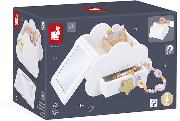 Szkatułka na biżuterię z motywem przewodnim jednorożca francuskiej marki JANOD to doskonała zabawka dla małej modnisi. Zestaw składa się z białej, drewnianej szkatułki w kształcie chmurki z ukrytą szufladką, przegródkami i pokrywką z lusterkiem. Dodatkowo w komplecie znajduje się magnes-gwiazdka, …