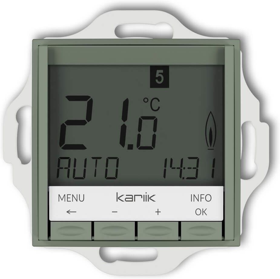 Regulator temperatury elektroniczny (podświetlenie niebieskie) w kolorze szałwiowym z serii ICON, marki Karlik. Regulator temperatury – nowoczesne rozwiązanie do kontroli ogrzewania Regulator temperatury to zaawansowane urządzenie służące do precyzyjnego sterowania temperaturą w pomieszczeniach oraz w systemach ogrzewania podłogowego. Dzięki niemu możliwe jest utrzymanie komfortowej temperatury w domu czy biurze, co przekłada się na wyższy komfort użytkowania oraz oszczędności energetyczne. Tryby pracy regulatora Regulator temperatury oferuje trzy tryby pracy, które umożliwiają dostosowanie jego działania do indywidualnych potrzeb: POMIESZCZENIE – tryb regulacji temperatury powietrza w pomieszczeniu, idealny do utrzymania stałej temperatury. PODŁOGA – tryb regulacji temperatury podłogi, dedykowany systemom ogrzewania podłogowego. OGRANICZNIK – tryb regulacji temperatury powietrza z jednoczesnym ograniczeniem maksymalnej temperatury podłogi, co zapobiega jej przegrzaniu. Jak regulator sprawdza temperaturę? Regulator temperatury posiada wbudowany czujnik temperatury powietrza, aby kontrolować temperaturę podłogi, konieczne jest dokupienie dodatkowej sondy (SO-1), którą można przedłużać kablami do maksymalnie 50 metrów, co zapewnia elastyczność w instalacji. Właściwości regulatora temperatury (zależne od wybranego trybu pracy) Wyświetlanie tekstu w linijkach ułatwiających obsługę Podświetlenie wyświetlacza w kolorze niebieskim Aktualny czas (ustawienie roku, miesiąca, dnia, godziny) Automatyczne przełączenie czasu zimowego i letniego Maks. 9 przedziałów czasowych na dobę (oddzielnych w ciągu doby) Domyślne i dostosowane programy czasowe Start optymalny (temperatura osiągnie wartość ustawioną) Programowalny także po odpięciu jednostki sterującej (wyświetlacza) Funkcja wyłączenia, przycisk MENU należy przytrzymać przez 10 sekund Funkcja wakacje z ustawieniem daty (można ustawić datę od...do) Wyświetlanie zużycia energii (czas włączenia * koszt) za ostatnie 2 dni, tydzień, 30 dni, rok Opcja ustawienia kosztów energii po godzinie Ochrona przed mrozem Temperaturę można nastawić tylko w ograniczonym zakresie Ochrona dostępu (niepożądane przestawienie) Możliwość wyboru języka obsługi Tryb sterowania PWM lub ZAL/WYL Minimalne wartości czasu ZAL/WYL i histerezy ustawione do kontroli ZAL/WYL Możliwość ustawienia wartości min. i max. temperatury podłogi (dotyczy trybu OGRANICZNIK) Ochrona zaworów (dotyczy trybów POMIESZCZENIE I OGRANICZNIK) Możliwość adaptacji do ustawienia zaworów w pozycji otwartej lub zamkniętej (dotyczy trybów POMIESZCZENIE I OGRANICZNIK) Możliwość wyboru funkcji grzania lub chłodzenia (dotyczy trybu POMIESZCZENIE) Pomiar temperatury w pomieszczeniu czujnika wewnętrznego (dotyczy trybu POMIESZCZENIE) lub za pomocą czujnika zdalnego (sondy - do zakupienia osobno) Zegar (Party) określona temperatura w ustawionym przedziale czasu (dotyczy trybów POMIESZCZENIE I PODŁOGA) Temperatura podłogi przedstawiona liczbowo (dotyczy trybu PODŁOGA) Przeciwwskazania użytkowania regulatora temperatury . Regulator temperatury przeznaczony jest do stosowania wyłącznie w pomieszczeniach suchych i w standardowych warunkach otoczenia. Nie należy go instalować w miejscach narażonych na bezpośrednie działanie promieni słonecznych, inne źródła ciepła/zimna oraz na ścianach zewnętrznych. Instalacja powinna być wykonana przez osobę z odpowiednimi kwalifikacjami, a przed przystąpieniem do niej należy wyłączyć napięcie zasilające. Maksymalna długość usuniętej izolacji przewodu nie może przekroczyć 8 mm.
