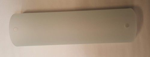 Klosz szklany biały . Szkło matowe . Wymiary : długość 24,50 cm szerokość 7,50 cm głębokość 6 cm odległość między otworami montażowymi 21,50 cm