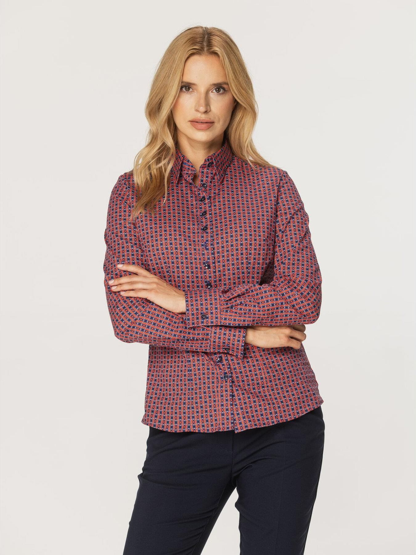 Taliowana koszula damska w granatowy i czerwony geometryczny wzór z krytym, podpinanym kołnierzykiem, tkanina z dodatkiem elastanu