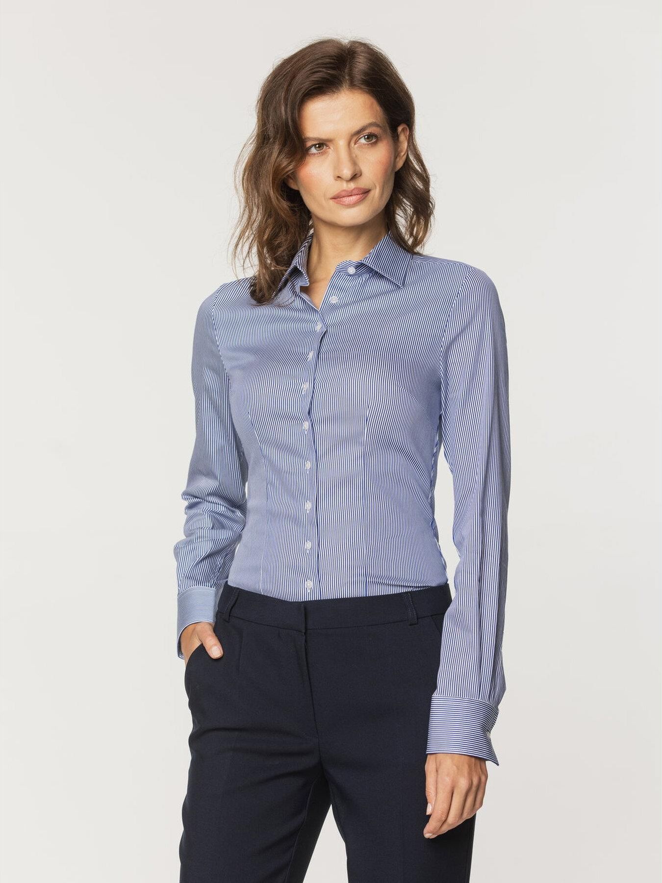 Klasyczna koszula damska typu long size w niebieskie i białe paski, formuła Stretch z dodatkiem elastanu