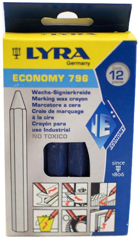 Kreda do oznaczeń, wodoodporna LYRA 796 Niezmywalna kreda woskowa do znakowania na różnych powierzchniach. Idealna w zastosowaniach w geodezji, budownictwie i przemyśle. Dane techniczne: Długość: 110 mm Średnica ∅: 11 mm Zakres dostawy: Kreda LYRA 796 wodoodporna niebieska12 szt. Dokument sprzedaży (Paragon / Faktura VAT)