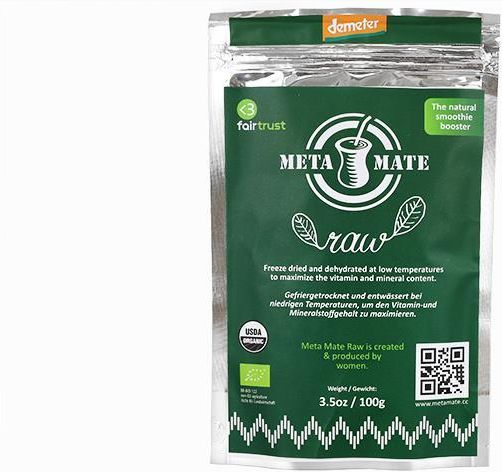 Meta Mate Raw to jedyna mate, która w została poddana procesowi mrożenia, zamiast suszenia w dymie czy gorącym powietrzu. To innowacyjne i unikalne na skalę całego yerbowego przemysłu! Dzięki temu w listkach zachowana zostaje maksymalna ilość witamin, minerałów (zwłaszcza cynk i magnez) oraz przeciwutleniaczy. Grubo-cięty susz to same intensywnie zielone listki, bez gałązek i pyłu. Napar ma łagodny, wyjątkowo świeży, trawiasty smak, kojarzący się trochę z herbatką z pokrzywy. Mocno wyczuwalne są także słodkawe nuty. Do zaparzania i do zjedzenia! Ze względu na proces obróbki susz Meta Mate RAW jest jadalny na surowo! Tak, takie listki możesz dodać do śniadania, zblendować ze swoim smoothie, zmielone dodać do czegokolwiek, jak przyprawę, a nawet zjeść bezpośrednio z paczki. Ekskluzywna mate z dobrą energią Meta Mate RAW pochodzi z limitowanej produkcji małego, brazylijskiego przedsiębiorstwa, gdzie dba się nie tylko o jakość produktu, ale też o godne wynagrodzenie i wspieranie lokalnej społeczności - w zakładzie zatrudnia się w przeważającej części kobiety dla wyrównywania szans. Filozofia firmy Meta Mate łączy się również nierozerwalnie z troską o środowisko naturalne. Listki zbierane są z dziko rosnących w natywnych lasach drzew ostrokrzewu paragwajskiego. Rośliny nie są eksploatowane ponad ich siły, jak to ma miejsce na plantacjach. Z każdego yerbowego drzewa zrywa się gałęzie tylko raz na kilka lat! Zbiory w różnych porach roku oznaczają, że w każdym z nich wybierane były inne drzewa. Opakowanie: 100 gram.